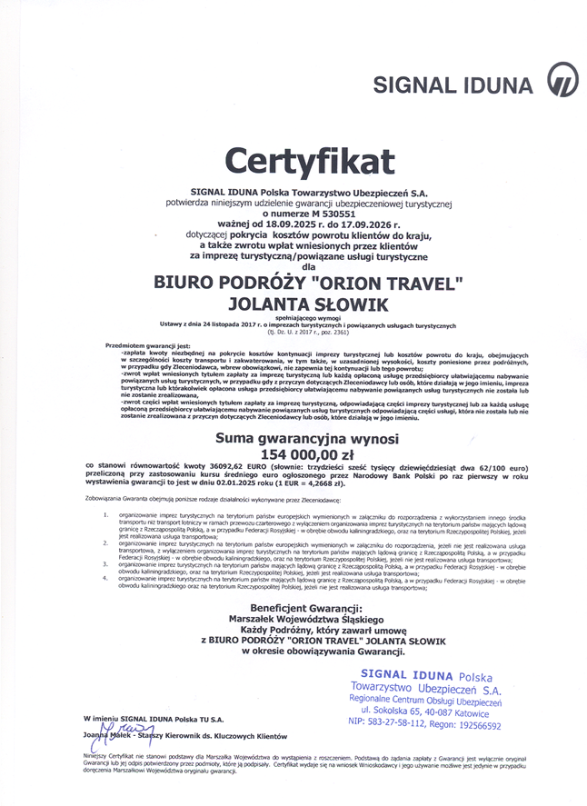 Jesteśmy firmą działającą na rynku od 1998 roku. Okres ten ugruntował naszą pozycję w branży turystycznej. Obdarzeni zostaliśmy zaufaniem wielu klientów, którzy cenią nas za wysoką jakość świadczonych usług oraz profesjonalizm w przygotowaniu imprez turystycznych takich jak zielone szkoły, kolonie, wycieczki krajowe i zagraniczne oraz pielgrzymki. Posiadamy zezwolenie organizatora turystyki nr 140, wydane przez Wojewodę Śląskiego. Zgodnie z Ustawą o Usługach Turystycznych posiadamy gwarancję ubezpieczeniową w związku z prowadzoną przez siebie działalnością w zakresie turystyki.